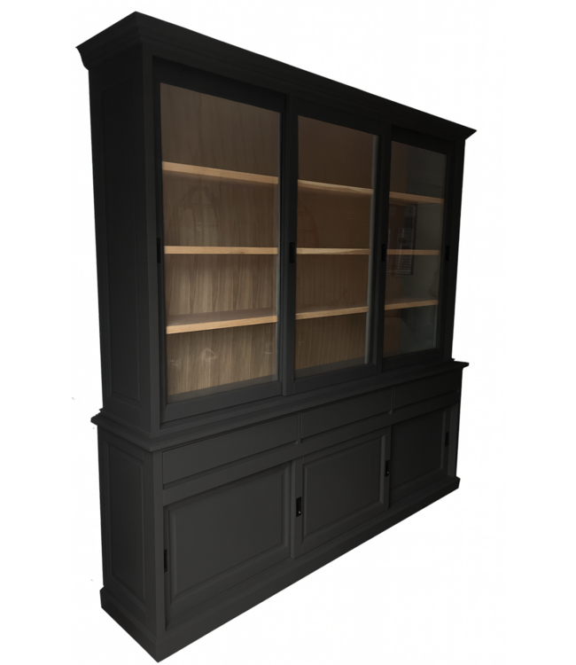 Buffetkast antraciet - eiken interieur Terwolde 240 x 240cm in de kleur antraciet met eiken interieur binnenkant is een mooie sfeervolle kast van massief Grenenhout met een dichte onderkast en glazen deuren in de bovenkast. De greeploze brede laden met luxe soft close sluiting en gespoten afwerking maken deze kast in het antraciet extra bijzonder. Deze mooie sfeervolle buffetkast antraciet in matte afwerking biedt veel opbergruimte voor spullen die je graag uit het zicht hebt in de onderkast en in het glazen gedeelte van de eiken interieur te buffetkast kan je je persoonlijke spullen etaleren. De mooie antraciete buffetkast Terwolde heeft schuifdeuren die op aluminium lopen wat zeer soepel en geruisloos gaat. Deze mooie landelijke buffetkast met landelijke uitstraling past zowel in de woonkamer als ook in de keuken. Je kunt de buffetkast Terwolde bestellen in alle RAL kleuren en in de RAL kleur 9010 is deze kast direct leverbaar. Deze buffetkast is daarmee uniek en speciaal en kun je aan je wensen aan passen Je kiest de kleur die het beste bij je interieur past. Je kunt zelfs de buitenkant en binnenkant van deze kast in verschillende kleuren laten uitvoeren.