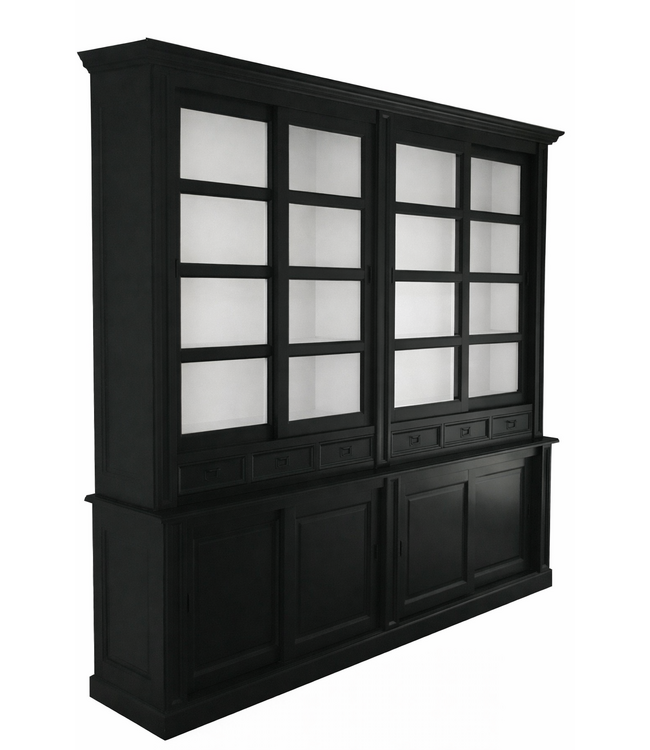 Buffetkast antraciet Utrecht 260 x 240cm in de chique kleur antraciet en de binnenkant in de kleur wit is een tijdloze kast van massief Grenenhout met een dichte onderkast met schuifdeuren en de bovenkast heeft tevens 4 schuifdeuren met vlak glas en laden met de luxe soft close sluiting. . Deze grote tijdloze buffetkast in het antraciet biedt veel opbergruimte voor spullen die je graag uit het zicht hebt in de onderkast en in het glazen gedeelte van de mooie buffetkast kan je je persoonlijke spullen etaleren. Buffetkast Utrecht heeft laden met invallende handgrepen en de luxe soft close sluiting en de schuifdeuren lopen op aluminium geleiders. Deze mooie grote en hoge imposante kast heeft een sfeervolle en landelijke uitstraling en past zowel in de woonkamer als ook in de keuken. Je kunt de grijze buffetkast Utrecht tevens bestellen in alle RAL kleuren en in de RAL kleur 9010 is deze kast direct leverbaar. Deze buffetkast is daarmee uniek en speciaal en kun je aan je wensen aan passen! Je kiest de kleur die het beste bij je interieur past. Je kunt zelfs de buitenkant en binnenkant van deze kast in verschillende kleuren laten uitvoeren