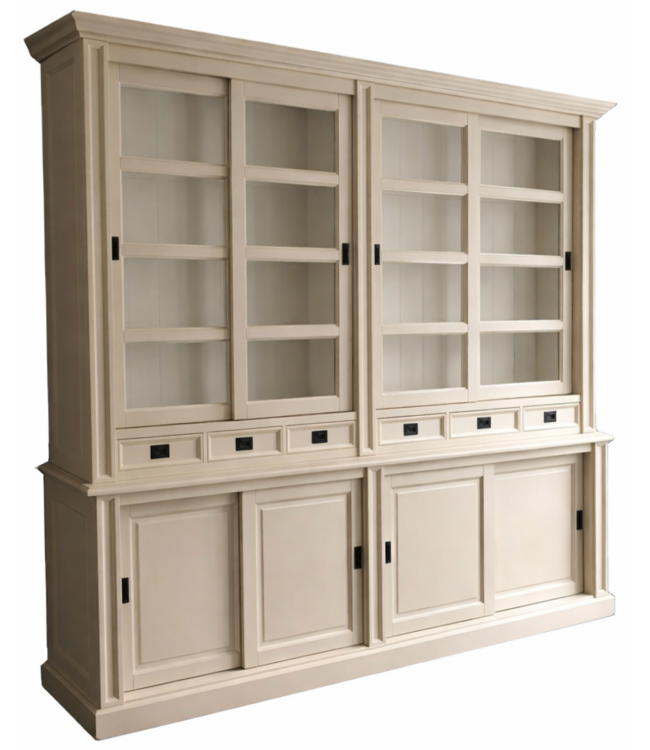 Buffetkast beige Utrecht 260 x 240cm in de warme kleur beige en de binnenkant in de kleur wit is een kast met een dichte onderkast met schuifdeuren en de bovenkast heeft tevens 4 schuifdeuren met vlakglas, roedeverdeling en laden. Deze grote en hoge kast met soft close laden biedt veel opbergruimte voor spullen die je graag uit het zicht hebt in de onderkast en in het glazen gedeelte van de beige buffetkast kan je je persoonlijke spullen etaleren. Buffetkast Utrecht heeft laden met strakke grepen en de schuifdeuren lopen op aluminium geleiders. Deze kast heeft een sfeervolle en landelijke uitstraling en past zowel in de woonkamer als ook in de keuken. Je kunt de beige buffetkast Utrecht tevens bestellen in alle RAL kleuren en in de RAL kleur 9010 is deze kast direct leverbaar. Deze buffetkast is daarmee uniek en speciaal en kun je aan je wensen aan passen! Je kiest de kleur die het beste bij je interieur past. Je kunt zelfs de buitenkant en binnenkant van deze kast in verschillende kleuren laten uitvoeren