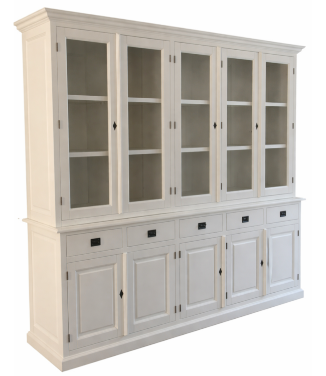 Buffetkast Dronten wit 250cm breed in de kleur wit gespoten en de binnenkant in het wit is een grote landelijke buffetkast gemaakt van massief Grenenhout met een dichte onderkast met draaideuren en soft close laden met authentieke invallende handgrepen en in de bovenkast draaideuren met glas. Deze grote landelijke buffetkast wit biedt heel veel opbergruimte voor spullen die je graag uit het zicht hebt in de onderkast en in het glazen gedeelte van de buffelkast kan je je persoonlijke spullen etaleren en de laden hebben de luxe soft close sluiting. .Deze mooie grote witte buffetkast heeft een landelijke uitstraling en past zowel in de woonkamer als ook in de keuken. Je kunt de buffetkast Dronten tevens bestellen in alle RAL kleuren en in de RAL kleur 9010 is deze kast direct leverbaar. Deze Buffetkast is daarmee uniek en speciaal en kun je aan je wensen aan passen! Je kiest de kleur die het beste bij je interieur past. Je kunt zelfs de buitenkant en binnenkant van deze kast in verschillende kleuren laten uitvoeren