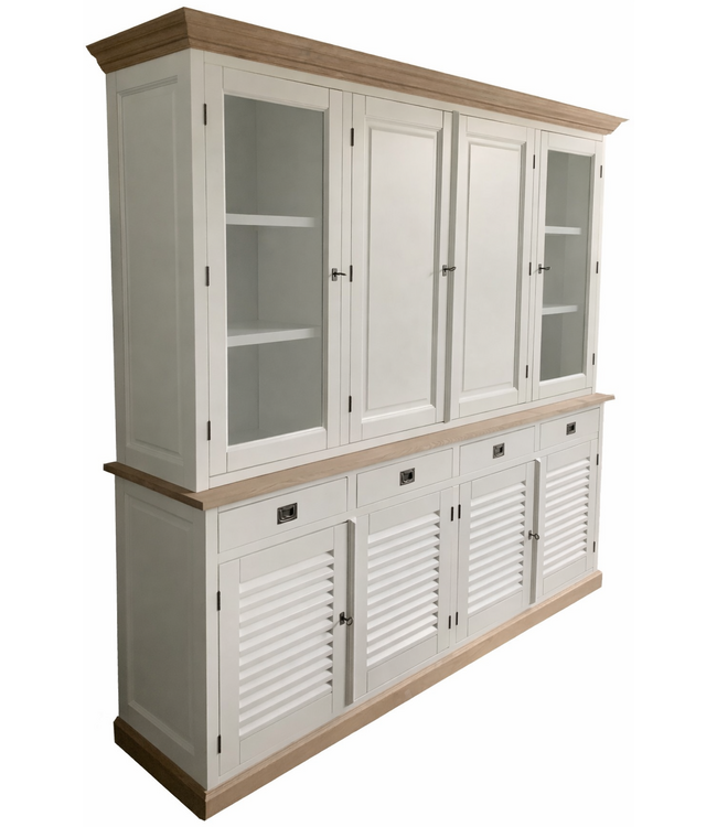 Buffetkast Dronten wit louvredeuren - eiken 220cm in de kleur wit gespoten en de binnenkant in het wit is een grote landelijke buffetkast gemaakt van massief Grenenhout met een dichte onderkast met louvredeuren en soft close laden met authentieke invallende handgrepen en in de bovenkast draaideuren met glas en dichte middendeuren. Deze grote landelijke buffetkast wit met eiken lijsten biedt heel veel opbergruimte voor spullen die je graag uit het zicht hebt in de onderkast en in het glazen gedeelte van de buffelkast kan je je persoonlijke spullen etaleren en de laden hebben de luxe soft close sluiting. .Deze mooie grote witte buffetkast heeft een landelijke uitstraling en past zowel in de woonkamer als ook in de keuken. Je kunt de buffetkast Dronten tevens bestellen in alle RAL kleuren en in de RAL kleur 9010 is deze kast direct leverbaar. Deze Buffetkast is daarmee uniek en speciaal en kun je aan je wensen aan passen! Je kiest de kleur die het beste bij je interieur past. Je kunt zelfs de buitenkant en binnenkant van deze kast in verschillende kleuren laten uitvoeren