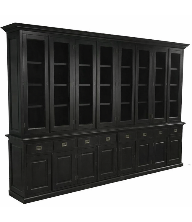 Buffetkast Dronten XL zwart 350cm breed in de chique kleur zwart gespoten en de binnenkant in het zwart is een grote buffetkast gemaakt van massief Grenenhout met een dichte onderkast met draaideuren en laden met authentieke invallende handgrepen en in de bovenkast draaideuren met glas. Deze mega grote buffetkast zwart biedt heel veel opbergruimte voor spullen die je graag uit het zicht hebt in de onderkast en in het glazen gedeelte van de buffelkast kan je je persoonlijke spullen etaleren end e laden hebben de luxe soft close sluiting. .Deze XL zwarte buffetkast heeft een landelijke uitstraling en past zowel in de woonkamer als ook in de keuken. Je kunt de buffetkast Dronten tevens bestellen in alle RAL kleuren en in de RAL kleur 9010 is deze kast direct leverbaar. Deze Buffetkast is daarmee uniek en speciaal en kun je aan je wensen aan passen! Je kiest de kleur die het beste bij je interieur past. Je kunt zelfs de buitenkant en binnenkant van deze kast in verschillende kleuren laten uitvoeren