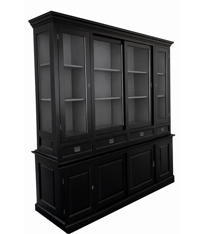 Buffetkast Eelde zwart - grijs 225 x 225cm in de warme kleur zwart en de binnenkant in het grijs is een sfeervolle buffetkast gemaakt van massief Grenen hout met een dichte onderkast met schuifdeuren en soft close laden met handgrepen en de bovenkast heeft schuifdeuren en draaideuren met glas en laden en de zijkanten van de bovenkast zijn eveneens van glas Deze mooie zwarte buffetkast biedt veel opbergruimte voor spullen die je graag uit het zicht hebt in de onderkast en in het glazen gedeelte van de buffetkast kan je je persoonlijke spullen etaleren. Deze buffetkast zwart heeft een sfeervolle en landelijke uitstraling en past zowel in de woonkamer als ook in de keuken. Je kunt de Buffetkast Eelde tevens bestellen in alle RAL kleuren en in de RAL kleur 9010 is deze kast direct leverbaar. Deze buffetkast Eelde is daarmee uniek en speciaal en kun je aan je wensen aan passen! Je kiest de kleur die het beste bij je interieur past. Je kunt zelfs de buitenkant en binnenkant van deze kast in verschillende kleuren laten uitvoeren