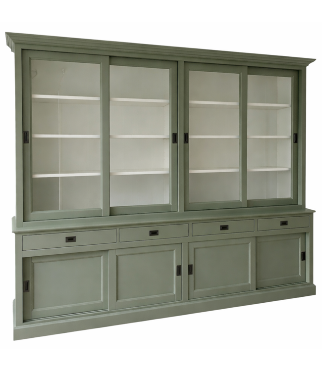 Buffetkast Engels groen Born 300 x 240cm soft close in de kleur Engels groen is een grote hoge buffetkast van massief Grenenhout met een dichte onderkast en glazen deuren in de bovenkast. De strakke invallende handgrepen op de lade met luxe soft close sluiting en gladde gespoten afwerking maken deze mooie landelijke wijnrode buffetkast extra bijzonder. Deze wijnrode landelijke kast biedt veel opbergruimte voor spullen die je graag uit het zicht hebt in de onderkast en in het glazen gedeelte van de buffetkast kan je je persoonlijke spullen etaleren. De grote wijnrode buffetkast Born heeft schuifdeuren die op aluminium lopen wat zeer soepel en geruisloos gaat. Deze buffetkast met landelijke uitstraling past zowel in de woonkamer als ook in de keuken. Je kunt de buffetkast Born bestellen in alle RAL kleuren en in de RAL kleur 9010 is deze kast direct leverbaar. Deze buffetkast is daarmee uniek en speciaal en kun je aan je wensen aan passen! Je kiest de kleur die het beste bij je interieur past. Je kunt zelfs de buitenkant en binnenkant van deze kast in verschillende kleuren laten uitvoeren.