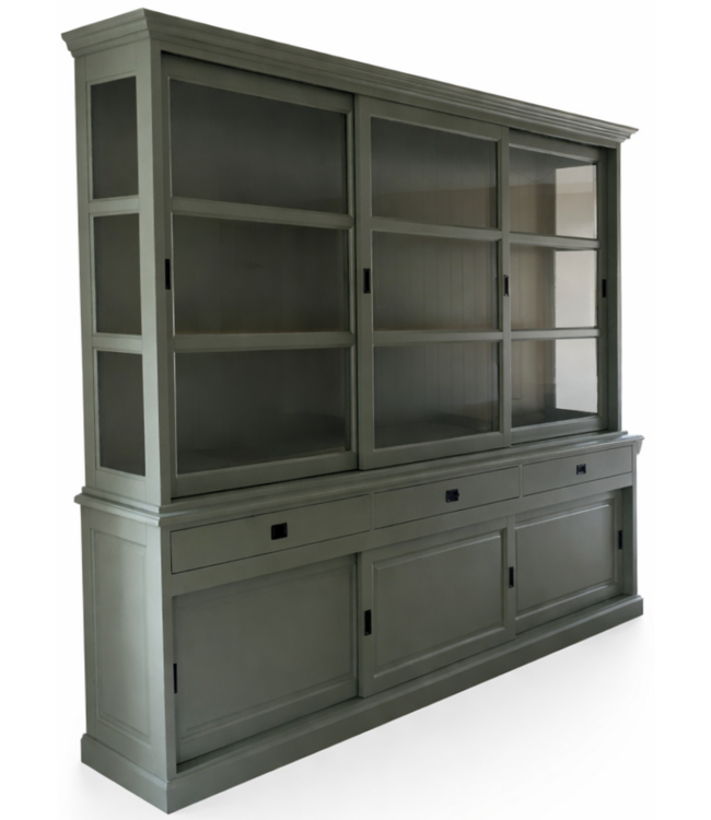 Buffetkast Engels groen - Engels groen Putten 300 x 240cm in de kleur Engels groen met Engels groene binnenkant is een mooie grote kast van massief Grenenhout met een dichte onderkast en glazen deuren in de bovenkast. De strakke handgrepen op de brede laden met luxe soft close sluiting en gladde gespoten afwerking maken deze kast in oud Engels groen extra bijzonder. Deze grote mooie sfeervolle buffetkast biedt veel opbergruimte voor spullen die je graag uit het zicht hebt in de onderkast en in het glazen gedeelte van de Engels groene buffetkast kan je je persoonlijke spullen etaleren. De grote oud Engels groen kleurige buffetkast Putten XL heeft schuifdeuren die op aluminium lopen wat zeer soepel en geruisloos gaat. De zijkanten van de bovenkast van de buffetkast Putten zijn van glas wat een mooie doorkijk en lichtinval in de kast geeft wat deze kast ook zeer goed toepasbaar maakt als vitrine kast. Deze mooie grote buffetkast met landelijke uitstraling past zowel in de woonkamer als ook in de keuken. Je kunt de buffetkast Putten XL bestellen in alle RAL kleuren en in de RAL kleur 9010 is deze kast direct leverbaar. Deze buffetkast is daarmee uniek en speciaal en kun je aan je wensen aan passen Je kiest de kleur die het beste bij je interieur past. Je kunt zelfs de buitenkant en binnenkant van deze kast in verschillende kleuren laten uitvoeren.