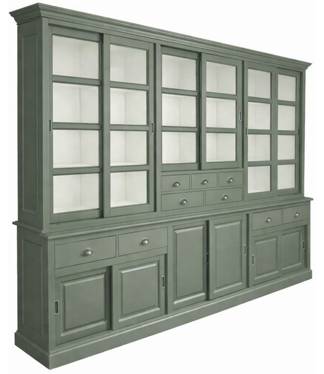 Buffetkast Engels groen Haarlem 285cm breed in de klassieke kleur groen gespoten en de binnenkant in het wit is een Buffetkast gemaakt van massief Grenenhout met een dichte onderkast met schuifdeuren en laden met invallende handgrepen en in de bovenkast schuifdeuren met glas en laden. Deze grote groene Buffetkast biedt veel opbergruimte voor spullen die je graag uit het zicht hebt in de onderkast en in het glazen gedeelte van de grote kast kan je je persoonlijke spullen etaleren. Deze landelijke mooie Buffetkast heeft een landelijke uitstraling en past zowel in de woonkamer als ook in de keuken. Je kunt de Buffetkast Haarlem tevens bestellen in alle RAL kleuren en in de RAL kleur 9010 is deze kast direct leverbaar. Deze Buffetkast is daarmee uniek en speciaal en kun je aan je wensen aan passen! Je kiest de kleur die het beste bij je interieur past. Je kunt zelfs de buitenkant en binnenkant van deze kast in verschillende kleuren laten uitvoeren