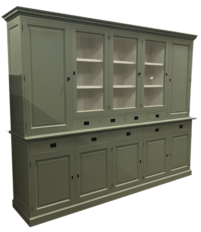 Buffetkast Engels groen Lelystad 300 x 235cm in de kleur Engels groen en de binnenkant in het wit is een grote landelijke buffetkast gemaakt van massief grenenhout met een dichte onderkast met draaideuren en laden met komgrepen en de bovenkast heeft draaideuren met glas en de 2 buitenste deuren zijn dicht. Deze grote hoge mooie buffetkast Engels groen biedt veel opbergruimte voor spullen die je graag uit het zicht hebt in de onderkast en in het glazen gedeelte van de buffetkast kan je je persoonlijke spullen etaleren. Deze mooie Engels groene buffetkast heeft een sfeervolle en landelijke uitstraling en past zowel in de woonkamer als ook in de keuken. Je kunt de Buffetkast Lelystad tevens bestellen in alle RAL kleuren en in de RAL kleur 9010 is deze kast direct leverbaar. Deze buffetkast is daarmee uniek en speciaal en kun je aan je wensen aan passen! Je kiest de kleur die het beste bij je interieur past. Je kunt zelfs de buitenkant en binnenkant van deze kast in verschillende kleuren laten uitvoeren