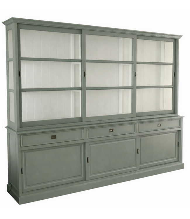 Buffetkast Engels groen Sneek 300cm breed in de kleur Engels groen met witte binnenkant is een mooie grote kast van massief Grenenhout met een dichte onderkast en glazen deuren in de bovenkast. De strakke handgrepen op de brede laden en gladde gespoten afwerking maken deze kast in oud Engels groen extra bijzonder. Deze grote sfeervolle buffetkast biedt veel opbergruimte voor spullen die je graag uit het zicht hebt in de onderkast en in het glazen gedeelte van de Engels groene buffetkast kan je je persoonlijke spullen etaleren. De grote oud Engels groen kleurige buffetkast Sneek heeft schuifdeuren die op kunststofgeleiders lopen wat zeer soepel en geruisloos gaat. De zijkanten van de bovenkast van de buffetkast Sneek zijn van glas wat een mooie doorkijk en lichtinval in de kast geeft wat deze kast ook zeer goed toepasbaar maakt als vitrine kast. Deze mooie grote buffetkast met landelijke uitstraling past zowel in de woonkamer als ook in de keuken. Je kunt de buffetkast grijs Sneek bestellen in alle RAL kleuren en in de RAL kleur 9010 is deze kast direct leverbaar. Deze buffetkast is daarmee uniek en speciaal en kun je aan je wensen aan pass Je kiest de kleur die het beste bij je interieur past. Je kunt zelfs de buitenkant en binnenkant van deze kast in verschillende kleuren laten uitvoeren.