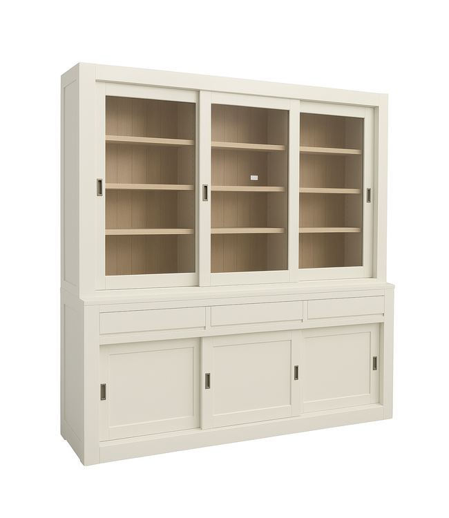 Buffetkast wit Enschede eiken interieur 240cm breed in de chique kleur wit met aan de binnenkant eiken schappen en een eiken achterwand is een grote mooie strakke vormgegeven kast van massief Grenenhout met een dichte onderkast en een glazen bovenkast beiden met schuifdeuren. De grote greeploze laden met luxe soft close sluiting, paneel achterwand, en gladde gespoten afwerking maken deze witte moderne buffetkast Enschede extra bijzonder. Deze sfeervolle grote witte kast met eiken interieur biedt veel opbergruimte voor spullen die je graag uit het zicht hebt in de onderkast en in het glazen gedeelte van de buffetkast wit Enschede kan je je persoonlijke spullen etaleren. De moderne Enschede buffetkast heeft schuifdeuren die in aluminium rails hangen en zeer soepel lopen. Deze witte buffetkast met landelijke uitstraling past zowel in de woonkamer als ook in de keuken. Je kunt de buffetkast design bestellen in alle RAL kleuren en in de RAL kleur 9010 is deze kast direct leverbaar. Deze buffetkast is daarmee uniek en speciaal en kun je aan je wensen aan passen! Je kiest de kleur die het beste bij je interieur past. Je kunt zelfs de buitenkant en binnenkant van deze kast in verschillende kleuren laten uitvoeren.