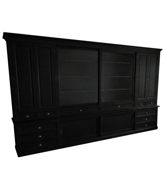 Buffetkast Goirle XXXL zwart 400x 240cm in de kleur zwart en de binnenkant in het grijs is een grote landelijke buffetkast gemaakt van massief Grenen hout met een dichte onderkast met schuifdeuren en laden met invallende handgrepen en de bovenkast heeft schuifdeuren met glas en dichte draaideuren aan de buitenkant en soft close laden. Deze mooie rode buffetkast biedt veel opbergruimte voor spullen die je graag uit het zicht hebt in de onderkast en in het glazen gedeelte van de buffetkast kan je je persoonlijke spullen etaleren. Deze sfeervolle zwarte buffetkast heeft een landelijke uitstraling en past zowel in de woonkamer als ook in de keuken. Je kunt de Buffetkast Goirle tevens bestellen in alle RAL kleuren en in de RAL kleur 9010 is deze kast direct leverbaar. Deze buffetkast Goirle is daarmee uniek en speciaal en kun je aan je wensen aan passen! Je kiest de kleur die het beste bij je interieur past. Je kunt zelfs de buitenkant en binnenkant van deze kast in verschillende kleuren laten uitvoeren