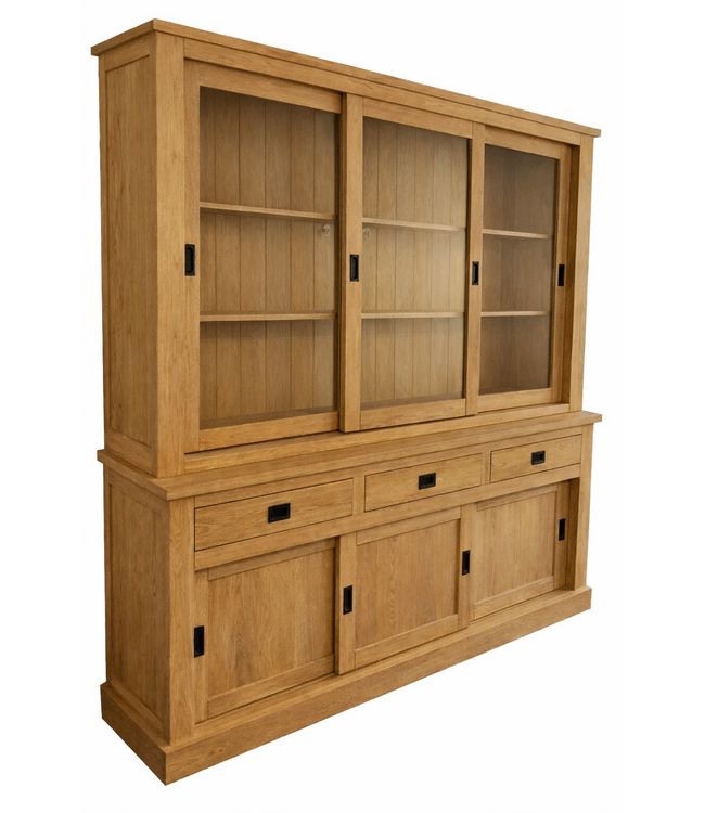 Buffetkast Gouda eiken – eiken 200 x 220cm | Materiaal: eiken - eiken fineer | Maten: 200 x 50/40 x 220cm | Kleur: buitenkant eiken binnenkant eiken | Schuifdeuren | Laden soft close | Deze kast wordt in 2 delen geleverd, onderkast