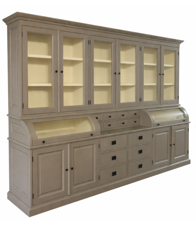 Buffetkast grijs Bastiaan 300m breed is een buffetkast in de trendy grijze kleur handgeschilderd van massief Grenenhout met een dichte onderkast met bolle glaskleppen en een glazen bovenkast. De komhandgrepen en bolle glaskleppen maken deze grote grijze kast extra bijzonder. Deze sfeervolle landelijke grote buffetkast met bolle kleppen biedt veel opbergruimte voor spullen die je graag uit het zicht hebt. In het glazen gedeelte van de buffetkast kan je je persoonlijke spullen etaleren. De grote laden in de onderkast en de kleine laden in het open gedeelte van de bovenkast geeft de kast een gezellige sfeervolle uitstraling en bied ruimte aan allerlei spulletjes. Deze grote buffetkast in het grijs met landelijke uitstraling past zowel in de woonkamer als ook in de keuken. Je kunt de Bastiaan buffetkast bestellen in alle RAL kleuren en in de RAL kleur 9010 is deze kast direct leverbaar. Deze buffetkast is daarmee uniek en speciaal aan je wensen aan te passen! Je kiest de kleur die het beste bij je interieur past Je kunt zelfs de buitenkant en binnenkant van deze kast in verschillende kleuren laten uitvoeren.