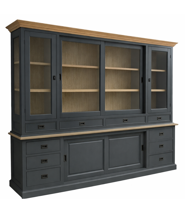 Buffetkast grijs - eiken interieur Eelde 225cm breed in de kleur grijs en de binnenkant heeft een eiken interieur en is een sfeervolle buffetkast gemaakt van massief Grenen hout met een dichte onderkast met schuifdeuren en soft close laden met handgrepen en de bovenkast heeft schuifdeuren en draaideuren met glas en laden en de zijkanten van de bovenkast zijn eveneens van glas Deze mooie sfeervolle grijze buffetkast met eiken interieur biedt veel opbergruimte voor spullen die je graag uit het zicht hebt in de onderkast en in het glazen gedeelte van de buffetkast kan je je persoonlijke spullen etaleren. Deze buffetkast grijs met eiken lijsten heeft een sfeervolle en landelijke uitstraling en past zowel in de woonkamer als ook in de keuken. Je kunt de Buffetkast Eelde tevens bestellen in alle RAL kleuren en in de RAL kleur 9010 is deze kast direct leverbaar. Deze buffetkast Eelde is daarmee uniek en speciaal en kun je aan je wensen aan passen! Je kiest de kleur die het beste bij je interieur past. Je kunt zelfs de buitenkant en binnenkant van deze kast in verschillende kleuren laten uitvoeren