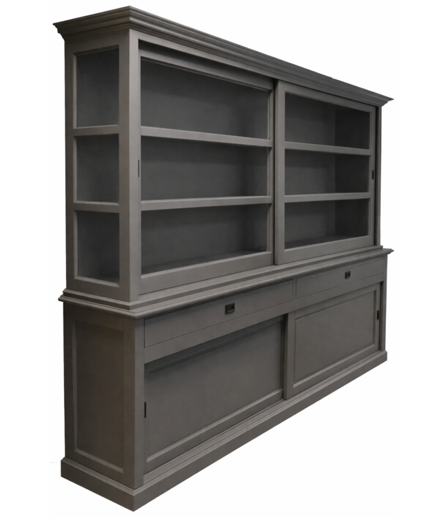 Buffetkast grijs Putten 260cm soft close breed in de kleur grijs is een sfeervolle grote kast van massief Grenenhout met een dichte onderkast en glazen deuren in de bovenkast. De strakke invallende handgrepen op de lade met luxe soft close sluiting en gladde gespoten afwerking maken deze kast extra bijzonder. Deze kast biedt veel opbergruimte voor spullen die je graag uit het zicht hebt in de onderkast en in het glazen gedeelte van de buffetkast kan je je persoonlijke spullen etaleren. De grijze grote buffetkast Putten heeft schuifdeuren die op aluminium lopen wat zeer soepel en geruisloos gaat. De zijkanten van de bovenkast van de buffetkast Putten zijn van glas wat een mooie doorkijk en lichtinval in de kast geeft. Deze buffetkast met landelijke uitstraling past zowel in de woonkamer als ook in de keuken. Je kunt de buffetkast Putten bestellen in alle RAL kleuren en in de RAL kleur 9010 is deze kast direct leverbaar. Deze buffetkast is daarmee uniek en speciaal en kun je aan je wensen aan passen! Je kiest de kleur die het beste bij je interieur past. Je kunt zelfs de buitenkant en binnenkant van deze kast in verschillende kleuren laten uitvoeren.