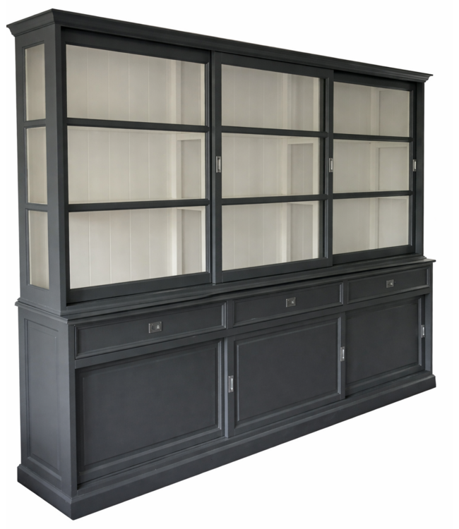 Buffetkast grijs Sneek 300cm breed in de kleur grijs is een mooie grote kast van massief Grenenhout met een dichte onderkast en glazen deuren in de bovenkast. De strakke handgrepen en gladde gespoten afwerking maken deze kast extra bijzonder. Deze kast biedt veel opbergruimte voor spullen die je graag uit het zicht hebt in de onderkast en in het glazen gedeelte van de grijze buffetkast kan je je persoonlijke spullen etaleren.De grote grijze buffetkast Sneek heeft schuifdeuren die op kunststofgeleiders lopen wat zeer soepel en geruisloos gaat. De zijkanten van de bovenkast van de buffetkast Sneek zijn van glas wat een mooie doorkijk en lichtinval in de kast geeft wat deze kast ook zeer goed toepasbaar maakt als vitrine kast. Deze buffetkast met landelijke uitstraling past zowel in de woonkamer als ook in de keuken. Je kunt de buffetkast grijs Sneek bestellen in alle RAL kleuren en in de RAL kleur 9010 is deze kast direct leverbaar. Deze buffetkast is daarmee uniek en speciaal en kun je aan je wensen aan passen