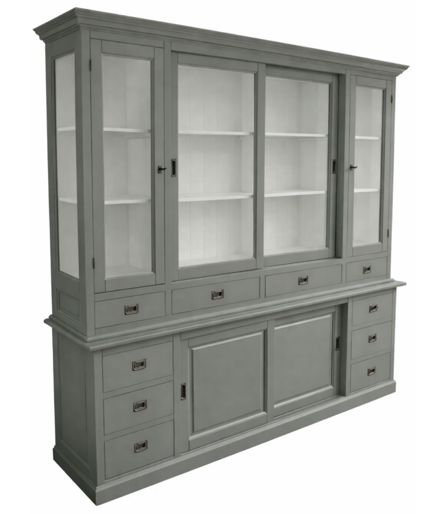 Buffetkast grijs Vleuten 225cm breed in de trendy kleur grijs en de binnenkant in het wit is een grote buffetkast gemaakt van massief Grenen hout met een dichte onderkast met schuifdeuren en laden met invallende handgrepen en de bovenkast heeft schuifdeuren en draaideuren met glas en laden en de zijkanten van de bovenkast zijn eveneens van glas Deze mooie grijze buffetkast biedt veel opbergruimte voor spullen die je graag uit het zicht hebt in de onderkast en in het glazen gedeelte van de buffetkast kan je je persoonlijke spullen etaleren. Deze buffetkast heeft een sfeervolle en landelijke uitstraling en de vlakke laden geven deze grijze kast een modern tintje en past zowel in de woonkamer als ook in de keuken. Je kunt de Buffetkast Vleuten tevens bestellen in alle RAL kleuren en in de RAL kleur 9010 is deze kast direct leverbaar. Deze buffetkast Vleuten is daarmee uniek en speciaal en kun je aan je wensen aan passen! Je kiest de kleur die het beste bij je interieur past. Je kunt zelfs de buitenkant en binnenkant van deze kast in verschillende kleuren laten uitvoeren