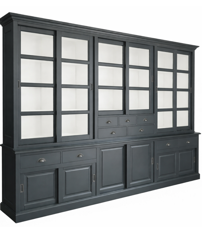Buffetkast leigrijs wit Haarlem 340 x 55/45 x 235cm in de klassieke kleur leigrijs gespoten en de binnenkant in het wit is een Buffetkast gemaakt van massief Grenenhout met een dichte onderkast met schuifdeuren en laden met invallende handgrepen en in de bovenkast schuifdeuren met glas en laden. Deze grote leigrijse Buffetkast biedt veel opbergruimte voor spullen die je graag uit het zicht hebt in de onderkast en in het glazen gedeelte van de grote kast kan je je persoonlijke spullen etaleren. Deze landelijke mooie Buffetkast heeft een landelijke uitstraling en past zowel in de woonkamer als ook in de keuken. Je kunt de Buffetkast Haarlem tevens bestellen in alle RAL kleuren en in de RAL kleur 9010 is deze kast direct leverbaar. Deze Buffetkast is daarmee uniek en speciaal en kun je aan je wensen aan passen! Je kiest de kleur die het beste bij je interieur past. Je kunt zelfs de buitenkant en binnenkant van deze kast in verschillende kleuren laten uitvoeren