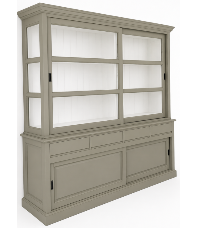 Buffetkast olijfgrijs Tilburg 240cm soft close breed in de kleur olijfgrijs is een sfeervolle kast van massief Grenenhout met een dichte onderkast en glazen deuren in de bovenkast. De strakke greeploze lade met luxe soft close sluiting en gladde gespoten afwerking maken deze kast extra bijzonder. Deze kast biedt veel opbergruimte voor spullen die je graag uit het zicht hebt in de onderkast en in het glazen gedeelte van de buffetkast kan je je persoonlijke spullen etaleren. De grote olijfgrijste buffetkast Tilburg heeft schuifdeuren die op aluminium lopen wat zeer soepel en geruisloos gaat. De zijkanten van de bovenkast van de buffetkast Tilburg zijn van glas wat een mooie doorkijk en lichtinval in de kast geeft. Deze buffetkast met landelijke uitstraling past zowel in de woonkamer als ook in de keuken. Je kunt de buffetkast Tilburg bestellen in alle RAL kleuren en in de RAL kleur 9010 is deze kast direct leverbaar. Deze buffetkast is daarmee uniek en speciaal en kun je aan je wensen aan passen! Je kiest de kleur die het beste bij je interieur past. Je kunt zelfs de buitenkant en binnenkant van deze kast in verschillende kleuren laten uitvoeren.