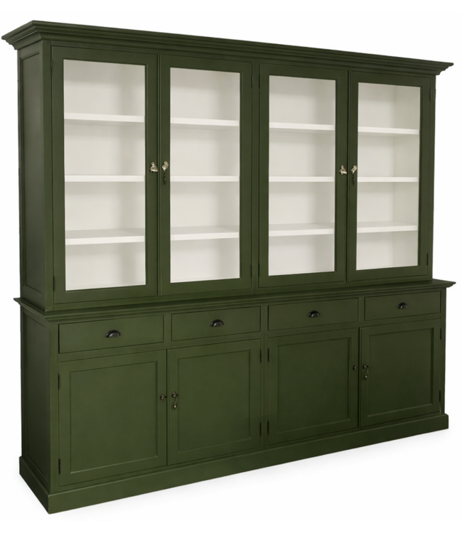 Buffetkast olijfgroen Haarlo 220cm breed is een grote landelijke buffetkast in de warme kleur olijfgroen gemaakt van massief Grenenhout met een dichte onderkast met draaideuren en laden en in de bovenkast draaideuren met glas. De olijfgroene kleur met witte binnenkant en de komgrepen op de laden geven deze kast een sfeervolle uitstraling . Deze authentiek buffetkast heeft veel opbergruimte voor spullen die je graag uit het zicht hebt in de onderkast en in het glazen gedeelte van de buffetkast kan je je persoonlijke spullen etaleren. De authentiek afwerking geven deze mooie sfeervolle olijf groen kast een landelijke uitstraling. Deze sfeervolle buffetlast heeft een landelijke uitstraling en past zowel in de woonkamer als ook in de keuken. Je kunt de kast Haarlo tevens bestellen in alle RAL kleuren. Deze buffetkast is daarmee uniek en speciaal en kun je aan je wensen aan passen! Je kiest de kleur die het beste bij je interieur past. Je kunt zelfs de buitenkant en binnenkant van deze kast in verschillende kleuren laten uitvoeren