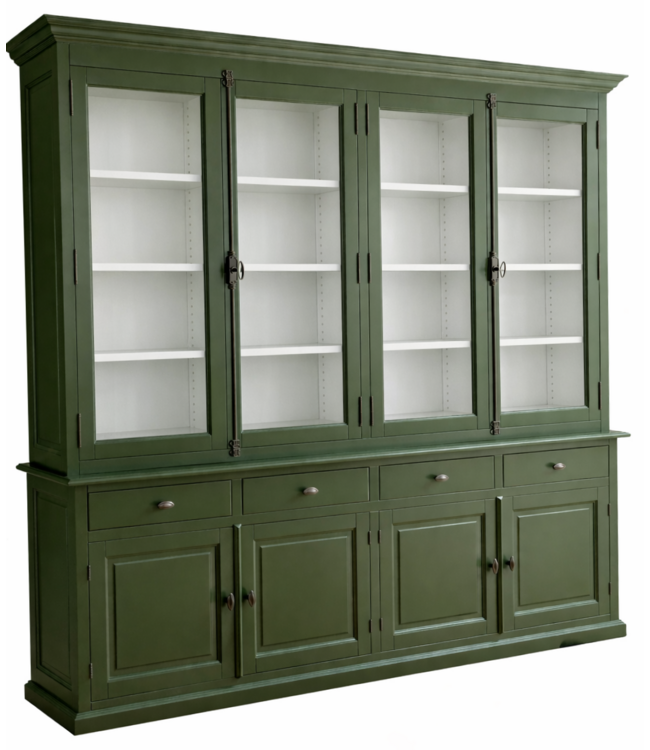 Buffetkast olijfgroen - wit Veren 240 x 240cm is een mooie klassieke olijfgroene buffetkast met witte binnenkant gemaakt van massief grenenhout met in de onderkast grote diepe laden met de luxe soft close sluiting en draaideuren en in de bovenkast met espagnoletsluiting met glas. Deze grote en hoge klassieke olijfgroene buffetkast Veren heeft biedt veel opbergruimte voor spullen die je graag uit het zicht hebt in de onderkast met laden en in het glazen gedeelte van de kast kan je je persoonlijke spullen etaleren. Buffetkast olijfgroen Veren is een statige kast en heeft een sfeervolle uitstraling. Door zijn tijdloze vormgeving past deze mooie olijfgroene kast in de woonkamer als ook in de keuken en in een klassiek als ook een design interieur. Je kunt de buffetkast Veren tevens bestellen in alle RAL kleuren. Deze kast is daarmee uniek en speciaal en kun je aan je wensen aan passen! Je kiest de kleur die het beste bij je interieur past. Je kunt zelfs de buitenkant en binnenkant van deze kast in verschillende kleuren laten uitvoeren