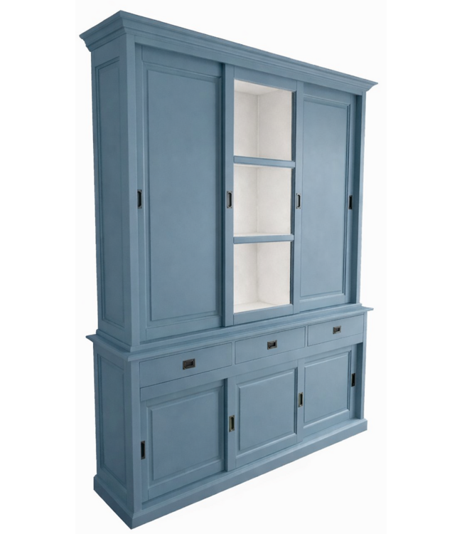 Buffetkast oud blauw - wit Putten 180 x 240cm dichte zijdeuren in de kleur oud blauw met witte binnenkant is een mooie grote sfeervolle buffetkast van massief grenenhout met een dichte onderkast met schuifdeuren en soft close laden en glazen en dichte deuren in de bovenkast. De strakke handgrepen op de brede laden met luxe soft close sluiting gespoten oud blauwe afwerking maken deze kast in oud blauw extra bijzonder. Deze grote mooie sfeervolle buffetkast biedt veel opbergruimte voor spullen die je graag uit het zicht hebt in de onderkast en in het glazen gedeelte van de buffetkast oud blauw kan je je persoonlijke spullen etaleren, achter de dichte deuren in de bovenkast heb je een zee aan extra opbergruimte.. De grote oud blauwe buffetkast Putten heeft schuifdeuren die op aluminium lopen wat zeer soepel en geruisloos gaat. Deze mooie grote buffetkast met landelijke uitstraling past zowel in de woonkamer als ook in de keuken. Je kunt de buffetkast Putten bestellen in alle RAL kleuren en in de RAL kleur 9010 is deze kast direct leverbaar. Deze buffetkast is daarmee uniek en speciaal en kun je aan je wensen aan passen Je kiest de kleur die het beste bij je interieur past. Je kunt zelfs de buitenkant en binnenkant van deze kast in verschillende kleuren laten uitvoeren.