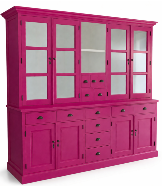 Buffetkast paars – wit Baarn 250cm breed is een apothekerskast gemaakt van Grenenhout in handgeschilderde afwerking in de mooie paarse kleur. De dichte onderkast met draaideuren en 6 laden en in de bovenkast draaideuren met glas een open vak en 12 laden geven deze landelijke handgeschilderd buffetkast een sfeervolle uitstraling. Deze grote paarse sfeervolle apothekerskast met 18 laden biedt veel opbergruimte voor spullen die je graag uit het zicht hebt in de onderkast en in het glazen gedeelte van de paarse kast Baarn kan je je persoonlijke spullen etaleren. De 18 laden hebben komgrepen en lopen op aluminium geleiders wat deze paarse buffetkast een sfeervolle en landelijke uitstraling geeft. Deze grote mooie buffetkast heeft en een landelijke uitstraling en past zowel in de woonkamer als ook in de keuken. Je kunt de paarse buffetkast Baarn tevens bestellen in alle RAL kleuren en in de RAL kleur 9010 is deze kast direct leverbaar. Deze buffetkast is daarmee uniek en speciaal en kun je aan je wensen aan passen! Je kiest de kleur die het beste bij je interieur past. Je kunt zelfs de buitenkant en binnenkant van deze kast in verschillende kleuren laten uitvoeren
