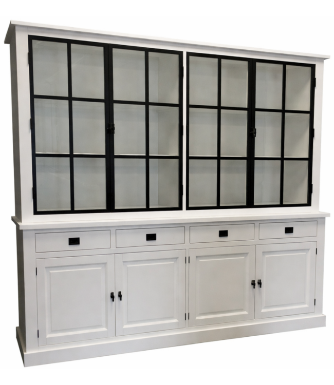 Buffetkast Soest wit met stalen deuren 250cm breed in de kleur wit gespoten en de binnenkant in het wit is een grote buffetkast met stalen deuren gemaakt van massief Grenenhout met een dichte onderkast met draaideuren en laden met authentieke invallende handgrepen en in de bovenkast stalen draaideuren met glas. Deze mooie buffetkast wit met stalen deuren biedt heel veel opbergruimte voor spullen die je graag uit het zicht hebt in de onderkast en in het glazen gedeelte van de buffetkast kan je je persoonlijke spullen etaleren en de laden hebben de luxe soft close sluiting. Deze mooie sfeervolle witte buffetkast Soest met stalen deuren heeft een landelijke uitstraling en past zowel in de woonkamer als ook in de keuken. Je kunt de buffetkast Soest tevens bestellen in alle RAL kleuren en in de RAL kleur 9010 is deze kast direct leverbaar. Deze Buffetkast is daarmee uniek en speciaal en kun je aan je wensen aan passen! Je kiest de kleur die het beste bij je interieur past. Je kunt zelfs de buitenkant en binnenkant van deze kast in verschillende kleuren laten uitvoeren