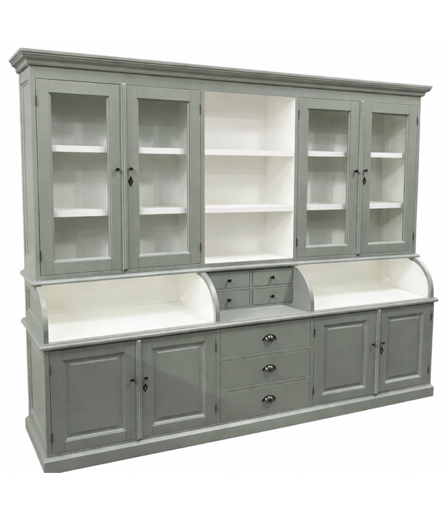 Buffetkast Engels groen 230cm breed is een grote landelijke kast van massief grenenhout gespoten in de Engels groene kleur aan de buitenkant en witte kleur aan de binnenkant met een dichte onderkast en een glazen bovenkast. De kom handgrepen op de grote diepe laden en gespoten afwerking en open vakken maken deze mooie Engels groene kast extra bijzonder. Deze Engels groen sfeervolle landelijke kast biedt veel opbergruimte voor spullen die je graag uit het zicht hebt. In het glazen gedeelte van de buffetkast kan je je persoonlijke spullen etaleren. Deze grutterskast Valburg met sfeervolle uitstraling past zowel in de woonkamer als ook in de keuken. Je kunt de Valburg buffetkast bestellen in alle RAL kleuren en in de RAL kleur 9010 is deze kast direct leverbaar. Deze buffetkast is daarmee uniek en speciaal aan je wensen aan te passen! Je kiest de kleur die het beste bij je interieur past. Je kunt zelfs de buitenkant en binnenkant van deze kast in verschillende kleuren laten uitvoeren.