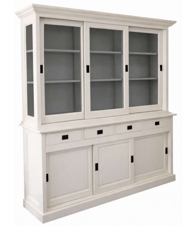 Buffetkast wit - grijs Jubbega 180cm breed in de witte kleur met warme kleur grijs binnenkant is een sfeervolle buffetkastkast van massief grenenhout met een dichte onderkast en een glazen bovenkast beiden met schuifdeuren en de onderkast heeft tevens laden. De strakke invallende handgrepen, vlakke laden en gladde gespoten afwerking maken deze witte kast met grijs binnenkant landelijke buffetkast extra bijzonder. Deze mooie sfeervolle kast in het wit met landelijke grijs binnenkant biedt veel opbergruimte voor spullen die je graag uit het zicht hebt in de onderkast en in het glazen gedeelte van de buffetkast kan je je persoonlijke spullen etaleren. Buffetkast Jubbega heeft schuifdeuren die in aluminium rails hangen en zeer soepel lopen. De laden lopen op aluminium rails en dit geeft een zeer luxe uitstraling en is heel gebruiksvriendelijk. Deze witte buffetkast met tijdloze uitstraling past zowel in de woonkamer als ook in de keuken. Je kunt de buffetkast Jubbega bestellen in alle RAL kleuren en in de RAL kleur 9010 is deze kast direct leverbaar. Deze strakke buffetkast is daarmee uniek en speciaal en kun je aan je wensen aan passen! Je kiest de kleur die het beste bij je interieur past. Je kunt zelfs de buitenkant en binnenkant van deze kast in verschillende kleuren laten uitvoeren.