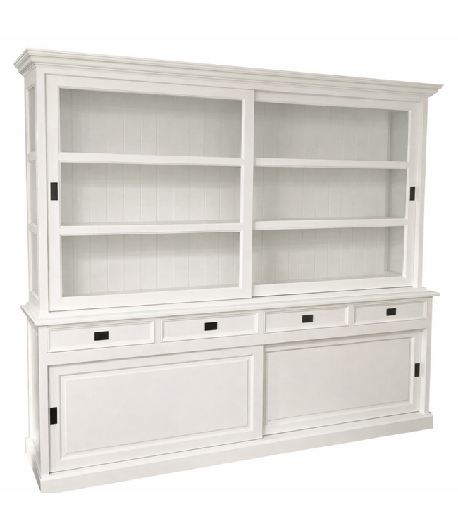 Buffetkast wit Montfoort 240cm breed in de kleur wit is een grote brede kast van massief Grenenhout met een dichte onderkast en een glazen bovenkast beiden met schuifdeuren. De strakke invallende handgrepen en gladde gespoten afwerking van deze mooie kast maken deze witte landelijke buffetkast extra bijzonder. Deze witte sfeervolle kast biedt veel opbergruimte voor spullen die je graag uit het zicht hebt in de onderkast en in het glazen gedeelte van de buffetkast wit kan je je persoonlijke spullen en verzamelingen etaleren. Buffetkast Montfoort heeft schuifdeuren die in aluminium rails hangen en zeer soepel lopen en laden zijn soft close en dit geeft een zeer luxe uitstraling en is heel gebruiksvriendelijk. De zijkanten van de bovenkast van de grote buffetkast Montfoort wit zijn van glas wat een mooie doorkijk en lichtinval in de kast geeft. Deze witte buffetkast met landelijke uitstraling past zowel in de woonkamer als ook in de keuken. Je kunt de buffetkast Montfoort bestellen in alle RAL kleuren en in de RAL kleur 9010 is deze kast direct leverbaar. Deze buffetkast is daarmee uniek en speciaal en kun je aan je wensen aan passen! Je kiest de kleur die het beste bij je interieur past. Je kunt zelfs de buitenkant en binnenkant van deze kast in verschillende kleuren laten uitvoeren.
