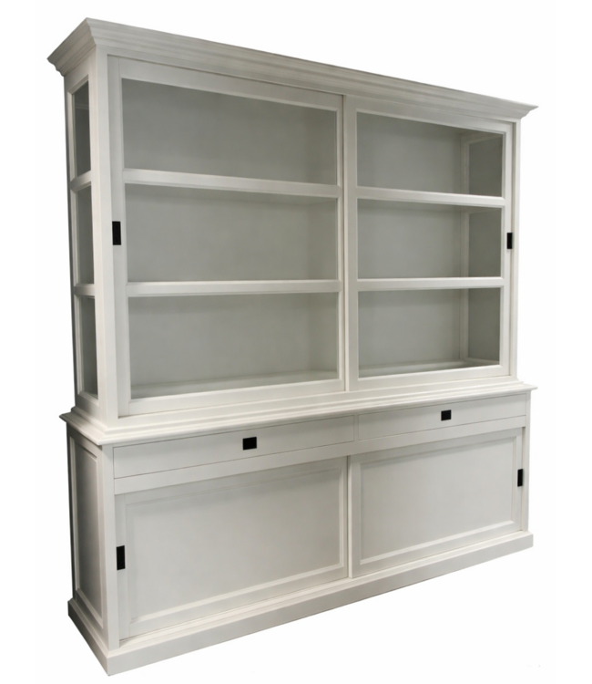 Buffetkast wit Putten 240 x 240cm soft close breed in de kleur wit is een grote kast van massief Grenenhout met een dichte onderkast en glazen deuren in de bovenkast. De strakke invallende handgrepen op de lade met luxe soft close sluiting en gladde gespoten afwerking maken deze mooie sfeervolle buffetkast extra bijzonder. Deze witte kast biedt veel opbergruimte voor spullen die je graag uit het zicht hebt in de onderkast en in het glazen gedeelte van de buffetkast kan je je persoonlijke spullen etaleren. De grote witte hoge buffetkast Putten heeft schuifdeuren die op aluminium lopen wat zeer soepel en geruisloos gaat. De zijkanten van de bovenkast van de buffetkast Putten zijn van glas wat een mooie doorkijk en lichtinval in de kast geeft. Deze buffetkast met landelijke uitstraling past zowel in de woonkamer als ook in de keuken. Je kunt de buffetkast Putten bestellen in alle RAL kleuren en in de RAL kleur 9010 is deze kast direct leverbaar. Deze buffetkast is daarmee uniek en speciaal en kun je aan je wensen aan passen! Je kiest de kleur die het beste bij je interieur past. Je kunt zelfs de buitenkant en binnenkant van deze kast in verschillende kleuren laten uitvoeren.