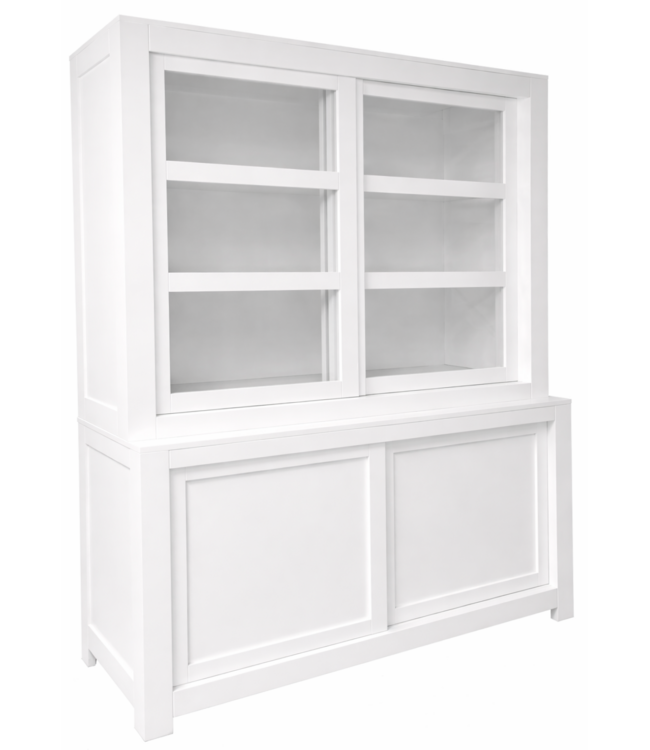 Buffetkast wit Rucphen 160cm in de kleur wit gespoten en de binnenkant in de kleur wit is een strakke vormgegeven design kast gemaakt van massief grenenhout met een dichte onderkast met schuifdeuren en in de bovenkast schuifdeuren met glas. Deze mooie moderne witte strakke buffetkast biedt veel opbergruimte voor spullen die je graag uit het zicht hebt in de onderkast en in het glazen gedeelte van de buffetkast wit Rucphen kan je je persoonlijke spullen etaleren. Buffetkast model Rucphen in het wit met witte binnenkant heeft een brede omlijsting van 10cm wat deze kast een stoer en robuust strak uiterlijk geeft en de witte binnenkant maakt dat je persoonlijke spullen nog mooier uitkomen Deze design buffetkast heeft een moderne uitstraling en past zowel in de woonkamer als ook in de keuken. Je kunt de kast Rucphen tevens bestellen in alle RAL kleuren en in de RAL kleur 9010 is deze kast direct leverbaar. Deze buffetkast strak is daarmee uniek en speciaal en kun je aan je wensen aan passen! Je kiest de kleur die het beste bij je interieur past. Je kunt zelfs de buitenkant en binnenkant van deze kast in verschillende kleuren laten uitvoeren