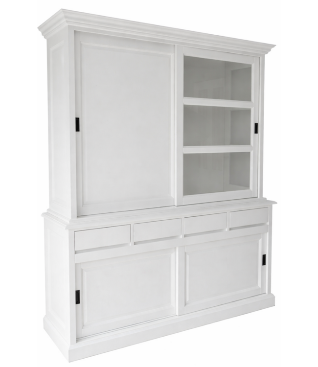 Buffetkast wit Tilburg dichte zijdeur 180cm breed in de kleur wit is een sfeervolle kast van massief Grenenhout met een dichte onderkast en glazen deuren in de bovenkast. De strakke greeploze lade met luxe soft close sluiting en gladde gespoten afwerking maken deze kast extra bijzonder. Deze kast biedt veel opbergruimte voor spullen die je graag uit het zicht hebt in de onderkast en in het glazen gedeelte van de buffetkast kan je je persoonlijke spullen etaleren. De grote witte buffetkast Tilburg heeft schuifdeuren die op aluminium lopen wat zeer soepel en geruisloos gaat. De zijkanten van de bovenkast van de buffetkast Tilburg zijn van glas wat een mooie doorkijk en lichtinval in de kast geeft. Deze buffetkast met landelijke uitstraling past zowel in de woonkamer als ook in de keuken. Je kunt de buffetkast Tilburg bestellen in alle RAL kleuren en in de RAL kleur 9010 is deze kast direct leverbaar. Deze buffetkast is daarmee uniek en speciaal en kun je aan je wensen aan passen! Je kiest de kleur die het beste bij je interieur past. Je kunt zelfs de buitenkant en binnenkant van deze kast in verschillende kleuren laten uitvoeren.
