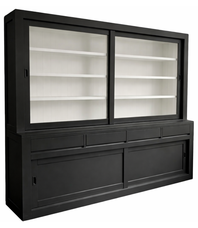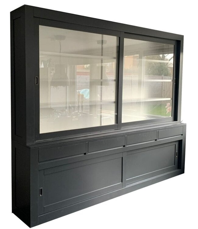 Buffetkast XXL antraciet Design 300 x 240cm in de kleur antraciet met witte binnenkant in gespoten afwerking is een grote en hoge strakke moderne design buffetkast gemaakt van massief Grenenhout met een dichte onderkast met schuifdeuren en greeploze laden en in de bovenkast schuifdeuren met glas. Deze hoge mooie strakke antraciet kast biedt veel opbergruimte voor spullen die je graag uit het zicht hebt in de onderkast en in het glazen gedeelte van de buffetkast antraciet Design kan je je persoonlijke spullen etaleren. Buffetkast hoog model Design heeft een brede omlijsting van 10cm wat deze kast een stoer en robuust uiterlijk geeft. De antraciet strakke hoge kast Design heeft greeploze laden en schuifdeuren die lopen op aluminium geleiders. Deze design buffetkast heeft een moderne uitstraling en past zowel in de woonkamer als ook in de keuken. Je kunt de kast Design tevens bestellen in alle RAL kleuren en in de RAL kleur 9010 is deze kast direct leverbaar. Deze buffetkast strak is daarmee uniek en speciaal en kun je aan je wensen aan passen! Je kiest de kleur die het beste bij je interieur past. Je kunt zelfs de buitenkant en binnenkant van deze kast in verschillende kleuren laten uitvoeren