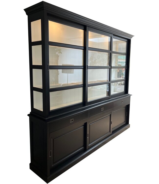 Buffetkast zwart Beverwijk 260 x 240cm led verlichting in de chique kleur zwart en de binnenkant in de kleur wit is een kast van massief Grenenhout met een dichte onderkast met schuifdeuren en de bovenkast heeft tevens 4 schuifdeuren met vlakglas en laden. Deze grote sfeervolle kast biedt veel opbergruimte voor spullen die je graag uit het zicht hebt in de onderkast en in het glazen gedeelte van de buffetkast kan je je persoonlijke spullen etaleren. Buffetkast Beverwijk heeft laden met strakke grepen en de schuifdeuren lopen op aluminium geleiders. Deze mooie buffetkast met led verlichting dimbaar heeft een sfeervolle en landelijke uitstraling en past zowel in de woonkamer als ook in de keuken. Je kunt de Buffetkast Beverwijk tevens bestellen in alle RAL kleuren en in de RAL kleur 9010 is deze kast direct leverbaar. Deze buffetkast is daarmee uniek en speciaal en kun je aan je wensen aan passen! Je kiest de kleur die het beste bij je interieur past. Je kunt zelfs de buitenkant en binnenkant van deze kast in verschillende kleuren laten uitvoeren