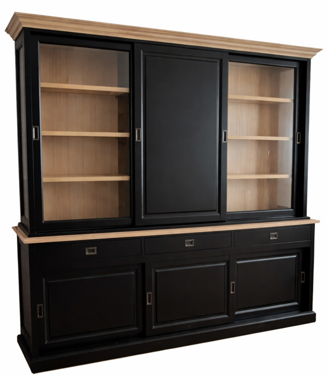 Buffetkast zwart Deurne 240 x 240cm dichte middendeur en eiken lijsten en interieur in de kleur zwart met eiken binnenkant is een mooie grote kast van massief Grenenhout met een dichte onderkast en glazen en dichte deuren in de bovenkast. De strakke handgrepen op de brede laden met luxe soft close sluiting en gladde gespoten afwerking van deze sfeervolle zwarte buffetkast met eiken interieur en lijsten maken deze buffetkast extra bijzonder. Deze grote mooie sfeervolle zwarte buffetkast biedt veel opbergruimte voor spullen die je graag uit het zicht hebt in de onderkast en in het glazen gedeelte van de Engels groene buffetkast kan je je persoonlijke spullen etaleren, achter de dichte middendeur in de bovenkast heb je een zee aan extra opbergruimte.. De grote zwarte buffetkast Deurne met eiken lijsten heeft schuifdeuren die op aluminium lopen wat zeer soepel en geruisloos gaat. De zijkanten van de bovenkast van de buffetkast Deurne zijn van glas wat een mooie doorkijk en lichtinval in de kast geeft wat deze kast ook zeer goed toepasbaar maakt als vitrine kast. Deze mooie grote buffetkast met landelijke uitstraling past zowel in de woonkamer als ook in de keuken. Je kunt de buffetkast Deurne bestellen in alle RAL kleuren en in de RAL kleur 9010 is deze kast direct leverbaar. Deze buffetkast is daarmee uniek en speciaal en kun je aan je wensen aan passen Je kiest de kleur die het beste bij je interieur past. Je kunt zelfs de buitenkant en binnenkant van deze kast in verschillende kleuren laten uitvoeren.