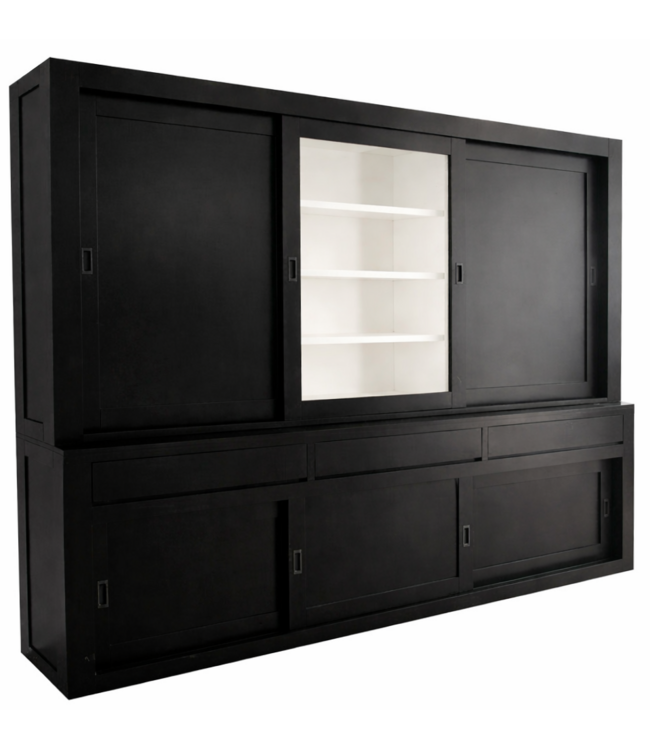 Buffetkast zwart Vaassen greeploos 260cm dichte zijdeuren in de kleur zwart gespoten en de binnenkant in het wit is een strakke moderne design buffetkast gemaakt van massief grenenhout met een dichte onderkast met schuifdeuren en greeploze laden en in de bovenkast 1 schuifdeur met vlakglas. En 2 dichte zijdeuren voor extra veel opbergruimte. Deze mooie grote strakke buffetkast in het zwart biedt veel opbergruimte voor spullen die je graag uit het zicht hebt in de onderkast en in het glazen gedeelte van de buffetkast zwart Vaassen kan je je persoonlijke spullen etaleren. De zwarte kast Vaassen heeft een brede omlijsting van 10cm wat deze kast een stoer en robuust strak uiterlijk geeft. De strakke kast Vaassen zwart heeft greeploze laden en schuifdeuren.. Deze buffetkast heeft een moderne uitstraling en past zowel in de woonkamer als ook in de keuken. Je kunt de zwarte kast Vaassen tevens bestellen in alle RAL kleuren en in de RAL kleur 9010 is deze kast direct leverbaar. Deze buffetkast strak is daarmee uniek en speciaal en kun je aan je wensen aan passen! Je kiest de kleur die het beste bij je interieur past. Je kunt zelfs de buitenkant en binnenkant van