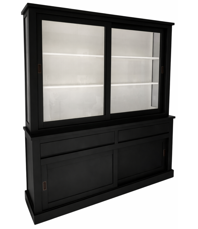 Buffetkast zwart Waalre 200cm breed in de kleur zwart met witte binnenkant is een strakke design buffetkastkast van massief grenenhout met een dichte onderkast en een glazen bovenkast beiden met schuifdeuren en de onderkast heeft tevens greeploze laden. De greeploze laden en gladde gespoten afwerking maken deze zwart strakke vormgegeven buffetkast extra bijzonder. Deze strakke kast in het zwart met witte binnenkant biedt veel opbergruimte voor spullen die je graag uit het zicht hebt in de onderkast en in het glazen gedeelte van de buffetkast kan je je persoonlijke spullen etaleren. Buffetkast Waalre heeft aan de zijkanten glas en schuifdeuren die in aluminium rails hangen en zeer soepel lopen. De laden zijn soft close en dit geeft een zeer luxe uitstraling en is heel gebruiksvriendelijk. Deze zwart buffetkast met design uitstraling past zowel in de woonkamer als ook in de keuken. Je kunt de buffetkast Waalre bestellen in alle RAL kleuren en in de RAL kleur 9010 is deze kast direct leverbaar. Deze strakke buffetkast is daarmee uniek en speciaal en kun je aan je wensen aan passen! Je kiest de kleur die het beste bij je interieur past. Je kunt zelfs de buitenkant en binnenkant van deze kast in verschillende kleuren laten uitvoeren.