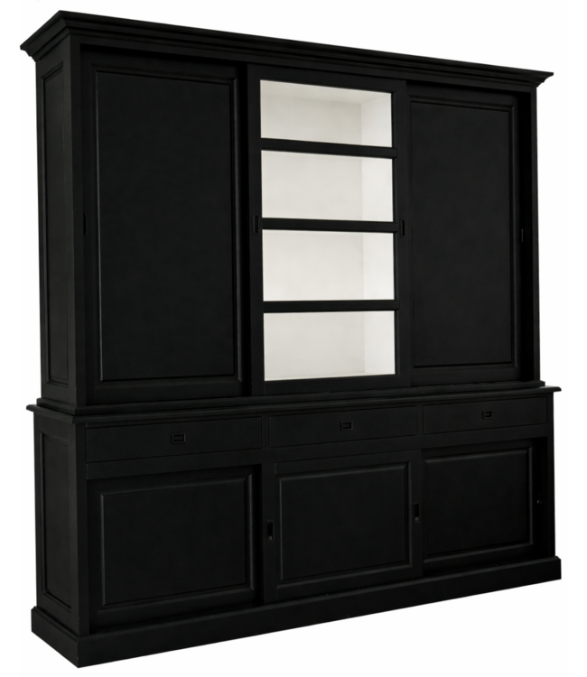 Buffetkast zwart - wit Putten 240 x 240cm dichte zijdeuren in de kleur zwart met witte binnenkant is een mooie grote sfeervolle buffetkast van massief grenenhout met een dichte onderkast met schuifdeuren en soft close laden en glazen en dichte deuren in de bovenkast. De strakke handgrepen op de brede laden met luxe soft close sluiting gespoten zwarte afwerking maken deze kast in zwart extra bijzonder. Deze grote mooie sfeervolle buffetkast biedt veel opbergruimte voor spullen die je graag uit het zicht hebt in de onderkast en in het glazen gedeelte van de buffetkast zwart kan je je persoonlijke spullen etaleren, achter de dichte deuren in de bovenkast heb je een zee aan extra opbergruimte.. De grote handpainted zwarte buffetkast Putten heeft schuifdeuren die op aluminium lopen wat zeer soepel en geruisloos gaat. Deze mooie grote buffetkast met landelijke uitstraling past zowel in de woonkamer als ook in de keuken. Je kunt de buffetkast Putten bestellen in alle RAL kleuren en in de RAL kleur 9010 is deze kast direct leverbaar. Deze buffetkast is daarmee uniek en speciaal en kun je aan je wensen aan passen Je kiest de kleur die het beste bij je interieur past. Je kunt zelfs de buitenkant en binnenkant van deze kast in verschillende kleuren laten uitvoeren.