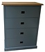 Dressoir babyblauw - eiken bovenblad Putten 90 x 110cm 4 soft close ladenin de kleur babyblauw gespoten is een dressoir gemaakt van massief Grenenhout met 4 laden soft close met invallende handgrepen Dit dressoir babyblauw bied veel opbergruimte voor spullen die je graag uit het zicht hebt. Dit mooie dressoir babyblauw heeft een landelijke uitstraling en past zowel in de woonkamer, hal, slaapkamer als ook in de keuken. Je kunt het dressoir Putten tevens bestellen in alle RAL kleuren en in de RAL kleur 904 is deze kast direct leverbaar. Dit babyblauw e dressoir is daarmee uniek en speciaal en kun je aan je wensen aan passen! Je kiest de kleur die het beste bij je interieur past. Je kunt zelfs de buitenkant en binnenkant van dit dressoir in verschillende kleuren laten uitvoeren.