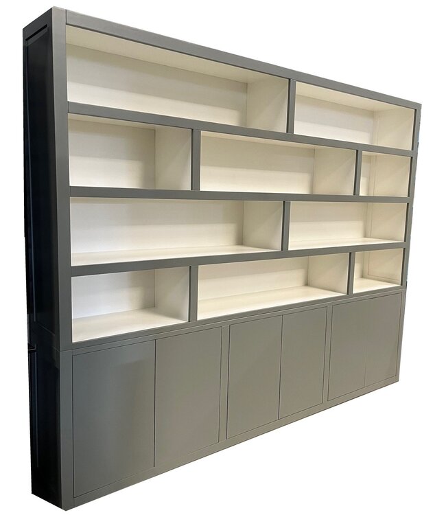 Strakke vakkenkast Engels groen ongelijke vakken 300 x 240cm | met witte binnenkant is een moderne kast. Deze vakkenkast met een dichte onderkast met push to open doors en de bovenkast heeft ongelijke open vakken. Deze mooie moderne strakke buffetkast in het Engels groen met witte binnenkant biedt veel opbergruimte voor spullen die je graag uit het zicht hebt in de onderkast en in de strak vormgegeven open vakken kan je je persoonlijke spullen etaleren. Deze design kubistische vakkenkast Engels groen strakke look met een design uitstraling en past zowel in de woonkamer als ook in de keuken. Je kunt de buffetkast Engels groen Kubus tevens bestellen in alle RAL kleuren en in de RAL kleur 9010 is deze kast direct leverbaar. Deze buffetkast is daarmee uniek en speciaal en kun je aan je wensen aan passen! Je kiest de kleur die het beste bij je interieur past. Je kunt zelfs de buitenkant en binnenkant van deze kast in verschillende kleuren laten uitvoeren